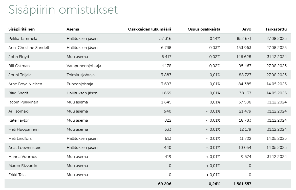 Edit: Itselleni yhtenä tärkeänä sijoituskriteerinä on sitoutunut johto myös osakeomistuksen kautta. Tämä on sellainen asia mikä Reveniossa on omalla kohdallani hieman hiertänyt. CFO ja CEO omistaa osakkeita todella vähän. Nyt kun osakekin on 5 vuoden pohjilla niin tuntuu, että eikö näillä hinnoilla kelpaisi napsia osakkeita salkkuun, mikäli tilanne niin sallii.