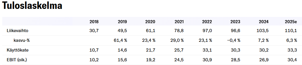 Kertoimet eivät ole halpoja, mutta yhtiön liikevaihto on osittain toistuvaa ja kasvu luo arvoa, niin on täysin perusteltua että yhtiötä tulisi hinnoitella korkeammalle. Markkina tuntuu odottavan uutta positiivista ajuria, ehkä M&A laitepuolelle. Itselleni tämä on maistunut näillä hinnoilla.