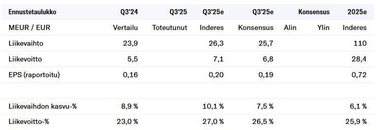 Liikevaihto 25,9 M€ vs. Konsensus 25,7 M€. Oik. Liikevoitto 6,2 M€ vs. Konsensus 6,8 M€.