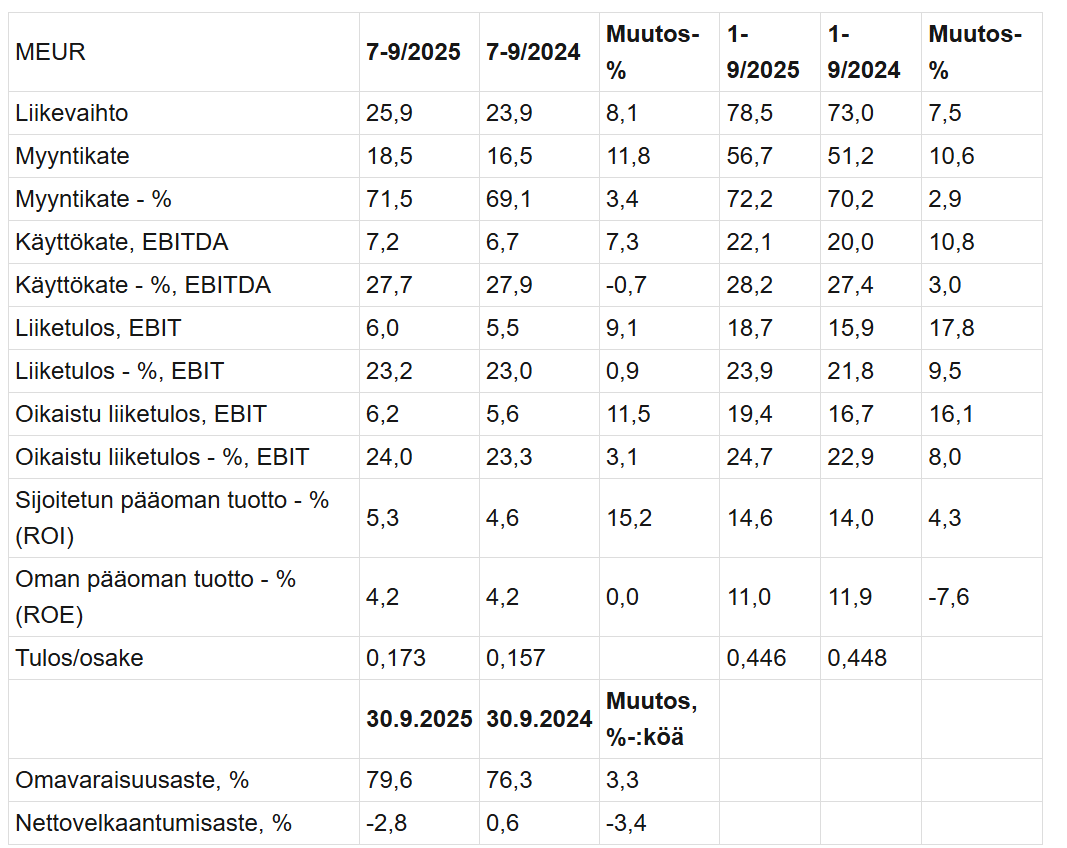 Liikevaihto oli 25,9 (23,9) miljoonaa euroa, kasvua 8,1 %
