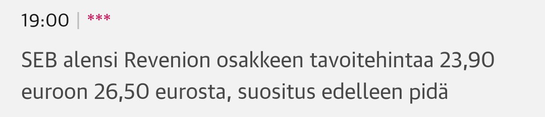 Lienevät kurssiin reagointia. Revenion tavoitehinnat ovat aina seuranneet enemmän kurssia jälkikäteen kuin todellista markkinatilannetta. Mikään oikeasti ei ole muuttunut ja nyt kun US sisäinen tilanne alkaa selkiytyä, markkinatilanne vain paranee. Tämä oli optimismia, sitä nyt tarvitaan maailmassa.