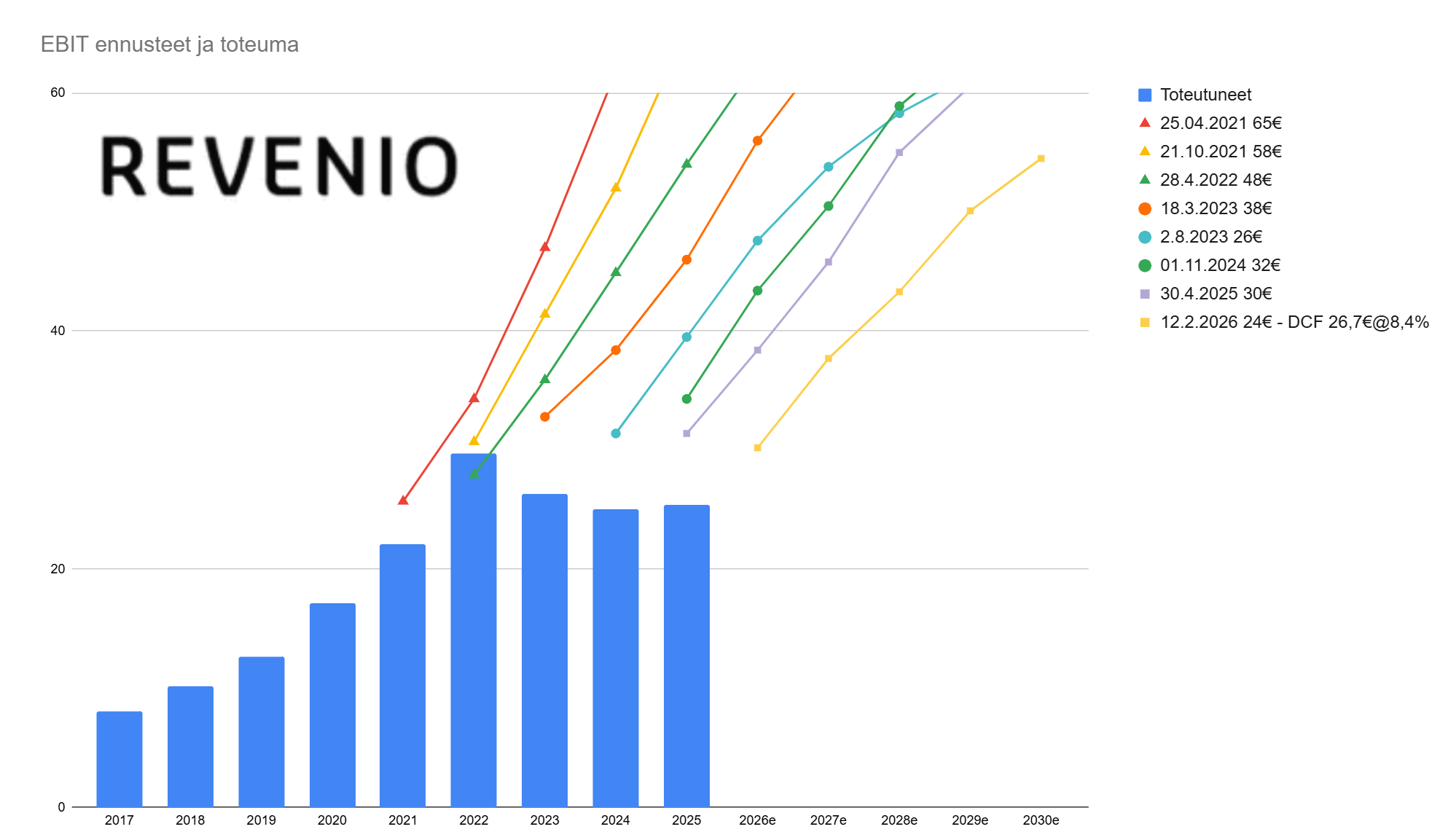 Miksi olet valinnut tarkastelun alkupisteeksi juuri tuon 25.4.2021 analyysin? Onhan Inderes seurannut Reveniota maailman sivun ja ennusteetkin osuneet varsin hyvin, pistemäisesti kurkkasin esim. Mikaelin 16.2.2018 raporttia, siinä EBIT-ura ihan kelvollinen jopa tähän päivään saakka ![]()
