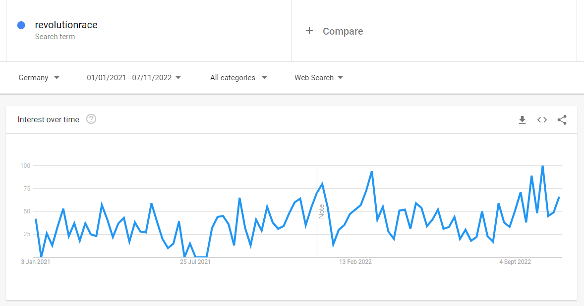 Jag har följt sökvolymerna för RevolutionRace på Google Trends, vilket jag tycker ger en bra indikation på e-handelsaktörens intresse och sökvolymer. RevolutionRaces sökvolymer har enligt trenden ökat fint även under Q3 jämfört med förra året: