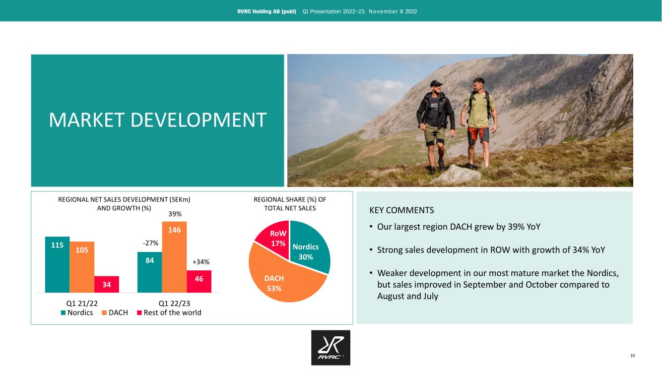 Onlineförsäljning av friluftsutrustning är en förvånansvärt känslig bransch. Inom ett svagt kvartal hittar jag enligt min mening både superframgångar och rejäla magplask. I Norden, där köpkraften är svag, har konsumenterna tydligt skurit ner på konsumtionen och försäljningen föll med hela 29 procent. Samtidigt växte det tyskspråkiga Europa med hela 39 procent och resten av världen med 34 procent. DACH-regionen står redan för över hälften av försäljningen. Tidigare har det kommunicerats att försäljning till exempelvis Tyskland är lönsammare än till Norden då mervärdesskatten är lägre.