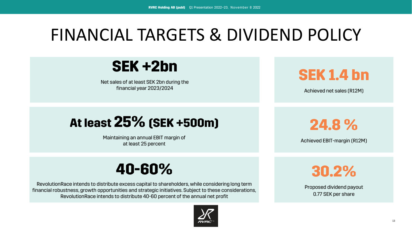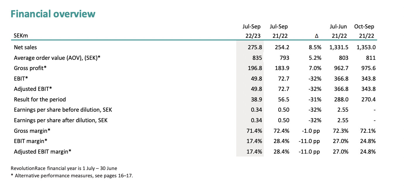 Bolaget meddelade att årets försäljning har startat med flackare tillväxtfaktorer än föregående kvartal, men man är på god väg mot målet för räkenskapsåret 1.7.23 – 30.6.24, det vill säga en försäljning på 2 miljarder kronor. Rullande 12 månader ligger nu på 1,47 miljarder. Marknadsturbulens lär dock fortsätta även framöver. Lönsamhetsmålet kan vara en tuffare utmaning, även om det redan har överträffats tidigare. Särskilt om man rör sig mot grundaren Pernillas vision och RevolutionRace klättrar mot en exportsuccé i klass med H&M, Ikea, Volvo och Spotify. Det är fortfarande en bit kvar till dessa jämförelseobjekt.
