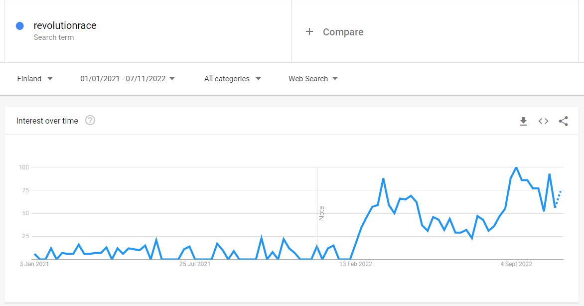Google Trends ger sannerligen intressanta kurvor. Svårt att veta hur man ska tolka dessa, då sökordet “revolutionrace” är på uppgång i Finland för i år, medan “revolution race” däremot sjunker: