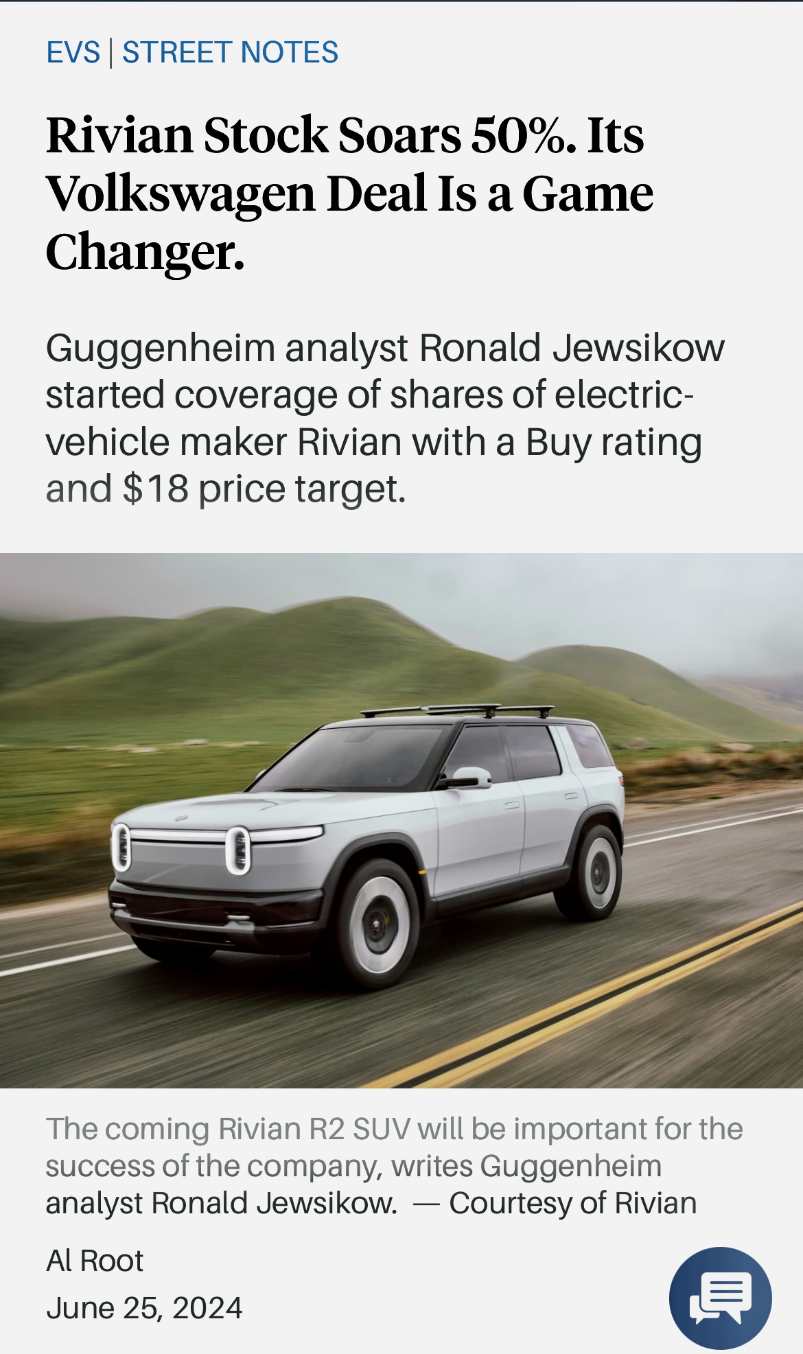 R2 on tulossa, mutta vasta 2026. Itsessään Rivianin autot tuntuu olevan erittäin korkealaatuisia ja brändistä tykätään, hype oli aikamoinen R2 “launch eventissä”. Itse olen niin surkea vain arvottamaan ei-voittoa tekeviä firmoja ettei osaa sanoa juuta eikä jaata. Yleensä tosin lähinnä yllätyn miten paljon niistä kuitenkin ollaan halukkaita maksamaan.