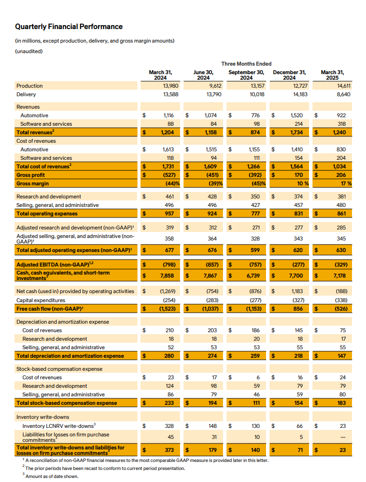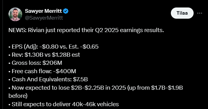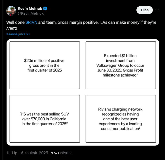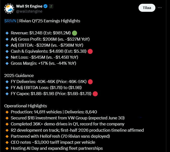 Rivianin vuoden 2025 ensimmäinen neljännes toi yhtiölle sen historian parhaan bruttokatteen, joka nousi positiiviseksi jo toista kertaa peräkkäin. Liikevaihto ylitti odotukset, vaikka yhtiö teki edelleen merkittävää nettotappiota ja käteisvarat jäivät hieman arvioidusta. Autotuotanto ja toimitukset olivat johdon ennusteiden mukaisia, ja R2-mallin kehitys etenee aikataulussa.