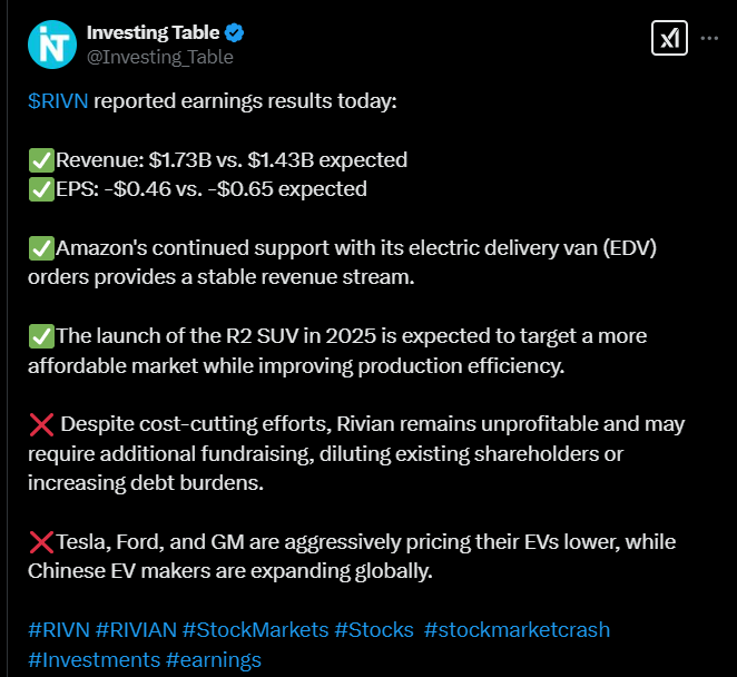 Rivian Automotive beat Wall Street’s expectations for the first quarter and confirmed its 2025 earnings targets, but negatively adjusted its 2025 targets for vehicle deliveries and capital spending amid tariffs.