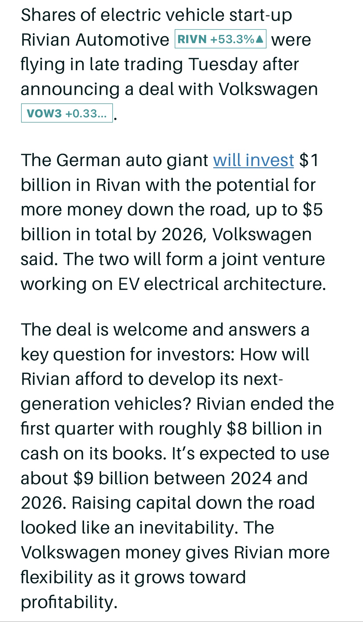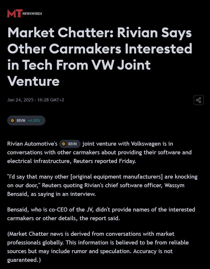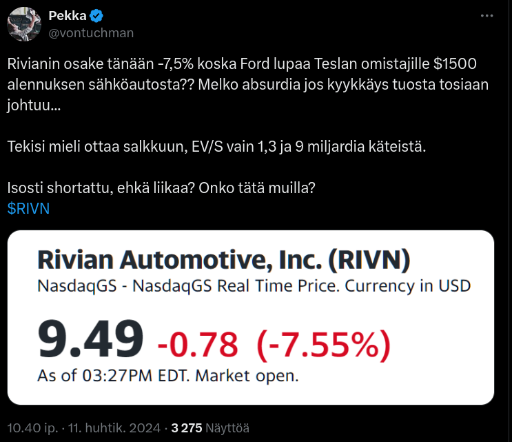 Ennemmin jos Rivianin techiin uskoo, niin silloin voisi olla paikallaan miettiä VW:n osakkeen ostoa. Kuitenkin mitä huonommin Rivianilla menee rahoituksen puolesta niin VW tuntuu mielellään ottavan jalansijaa Rivianista ja sen teknologiasta. Lisää rahoitustahan tuo Rivian taitaa tarvitsevankin taas jonkun ajan päästä.