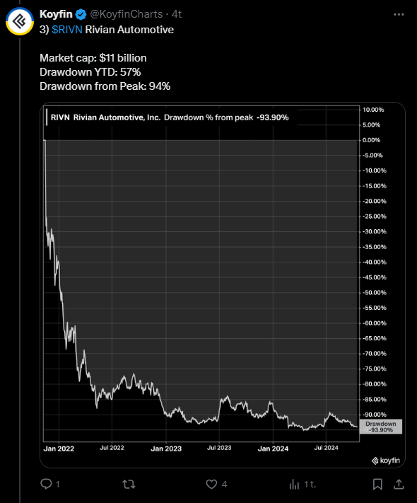 Rivianilla on markkinoiden ajoitusten suhteen käynyt älyttömän huono pulla. Alkuperäinen arvostus (oliko se yli 100 miljardia) nyt ampui tolkuttoman yli, eikä kymmenenkään miljardin arviolla ole kovin mieltäylentävää hypätä mukaan. Jäi siitä sentään kassaa että 2025 vielä selvittäneen, hankala tosin arvioida paljonko tuotannon ylösajo ja rakentamisen budjetti ampuu yli uudesta tehtaasta ensi vuonna.
