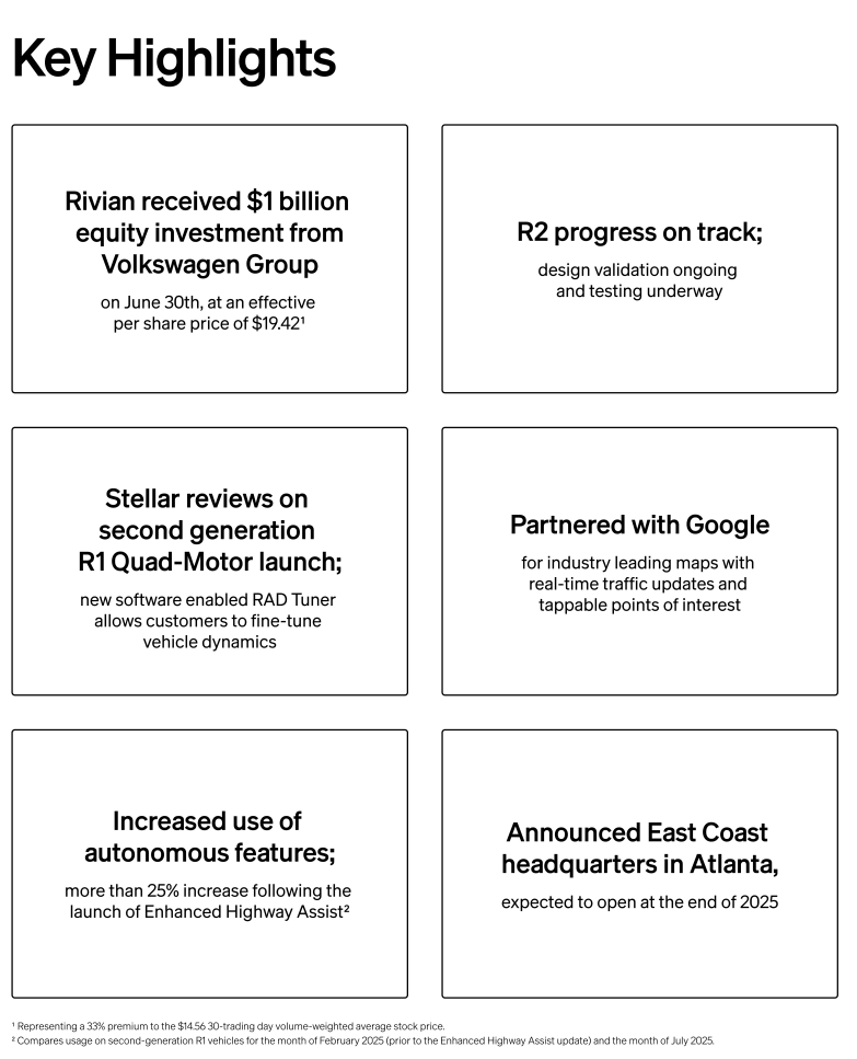 Toiminnallisesti Rivian teki ennätysmäärän koeajoja ja laajensi kumppanuuksiaan, mm.a HelloFreshin kanssa. Yhtiö valmistautuu AI-aiheiseen tapahtumaan ja painottaa tulevaisuuden kasvun rakentamista erityisesti R2-mallin ja kaupallisten ajoneuvoratkaisujen ympärille.