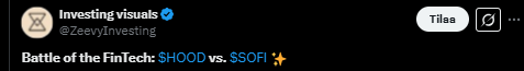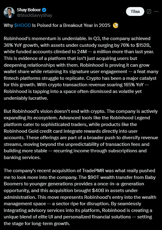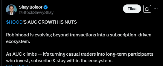 The tweet below states, among other things, that Robinhood is growing rapidly: in Q3 the company achieved 36 percent annual growth, assets under management rose by 76 percent, and user accounts exceeded the 24 million mark.