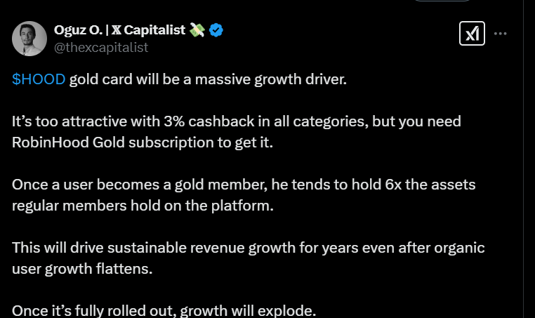 Here’s a tweet discussing Robinhood’s Gold card and how it would serve as a sustainable and strong revenue driver. I hadn’t previously realized its impact, even though I had read about it in the company’s materials before.