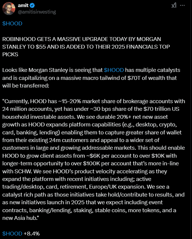 Morgan Stanley raised Robinhood’s price target to $55 and added it to its 2025 favorites, citing several growth opportunities.