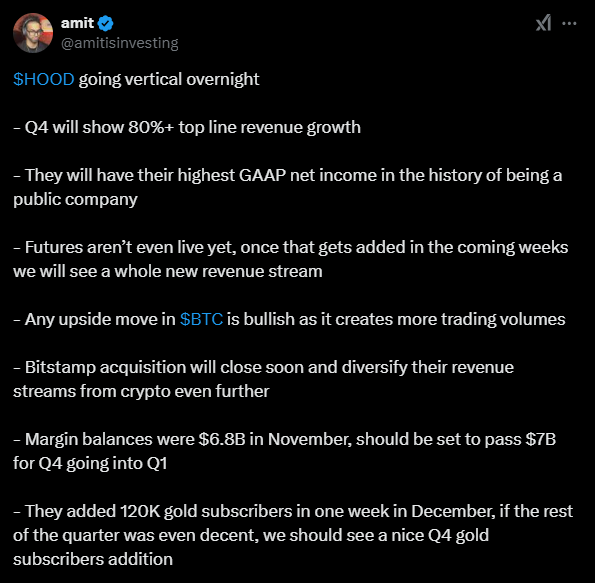 According to the tweet, RobinHood is growing strongly; Q4 revenue is predicted to rise over 80 percent and profit could be the best in the company’s history.