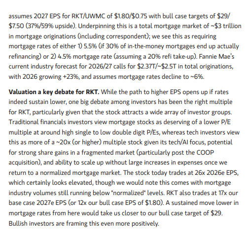 Näillä hinnoilla (19-22$) osakkeeseen on hinnoiteltu paljon tulevia onnistumisia, alhaisempia korkoja, ehkä jopa Trumpin tulevia Housing Crisis -toimia, kuten aiemmin kirjoittamani Fannie Mae ja Freddie Macin yksityistäminen ja MBS limiittien poisto. Kyseinen toimenpide saattaisi laskea korkoja nopeasti, stimuloida markkinaa sekä kuumentaa asuntomarkkinoita hyvinkin nopealla tahdilla ja antaisi Rocketin kursille uuden ajurin. Jos tuohon skenaarioon uskoo, niin myös Fannie Maen OTC osakkeen ostaminen voisi olla reilun nousukin jälkeen edelleen varteenotettava vaihtoehto. Laskeskelin, että FNMA arvo vähintään tuplaisi tuohon uutiseen.