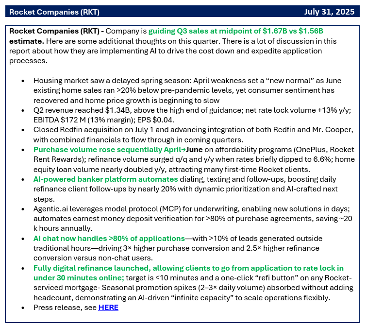 Viime kvartaalilla jokainen kuukausi oli asuntomarkkinoilla nousujohteinen huhtikuusta kesäkuulle, mikä voisi luvata pidempää kesäkautta, kun tullisotashokki alkoi viimein selvetä. Rocket auttoi viime kvartaalilla haastavassa markkinassa yli 100 000 henkilöä aloittamaan lainaprosessin, mikä on +19% edellisvuoteen verrattuna, kun samaan aikaan Existing Home Sales putosi toukokuusta kesäkuulle -2.7%. Saavutusta voi pitää erinomaisena, sillä Rocket mainosti, että asiakkaiden pysyvyys oli ollut hulppea 97%, joten vaikeasta markkinasta ilmestyi liuta uusia asiakkaita tulevaisuutta ajatellen. Tämä tietää erittäin hyvää jatkon kannalta, sillä asiakaspoistuma on ollut Rocketin bisneksessä aina erittäin alhainen. Lisäksi moni Rocketin asiakas on ottanut uuden lisälainan vanhan alempikorkoisen lainan päälle, jolla on katettu elämismenoja ja se on tuonut Rocketille lisäbisnestä