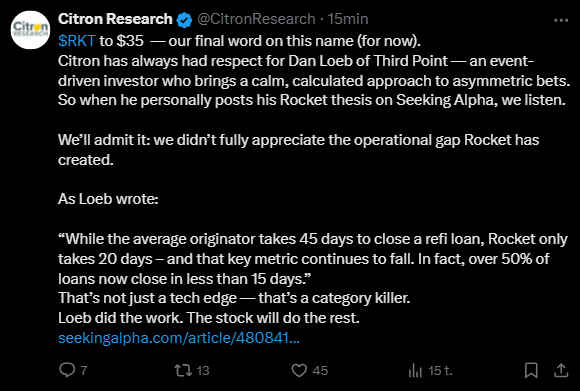 Analyytikoiden konsensus on tällä hetkellä, että tulos laskee ensin -7% 2025, nousee vuonna 2026 +206% ja jatkaa nousuaan +55% vielä vuonna 2027. Capex on myös nousussa eli n. 33% YoY, mikä on reilusti yli verrokkien, mutta se kertoo samalla miten aggressiivisesti Rocket panostaa AI:n kehitykseen/hyötykäyttöön ja sen tuomaan tehostamiseen. Kilpailijat saattavat olla panostuksien osalta pahasti alakynnessä, jos asuntomarkkina alkaisi osoittaa ensi vuoden aikana selkeää käänettä.