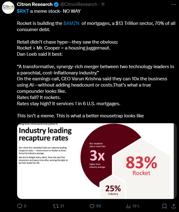Tällä hetkellä Rocketin P/E on n. 19,00$ hinnalla hulppea n. 82, eli 7x verrokkeja korkeampi, mutta Rocketin tapauksessa jokainen siihen sijoittanut ottaa näkemystä, että fuusiot onnistuvat, synergiat toteutuvat, korot laskevat, Trump tekee kaikkensa, että asuntolainat palautuvat järkeville tasoille ja keskivertoäänestäjien kukkarolle sopiviksi välivaaliehin menessä tai että tilanne ei ainakaan tästä heikkene.