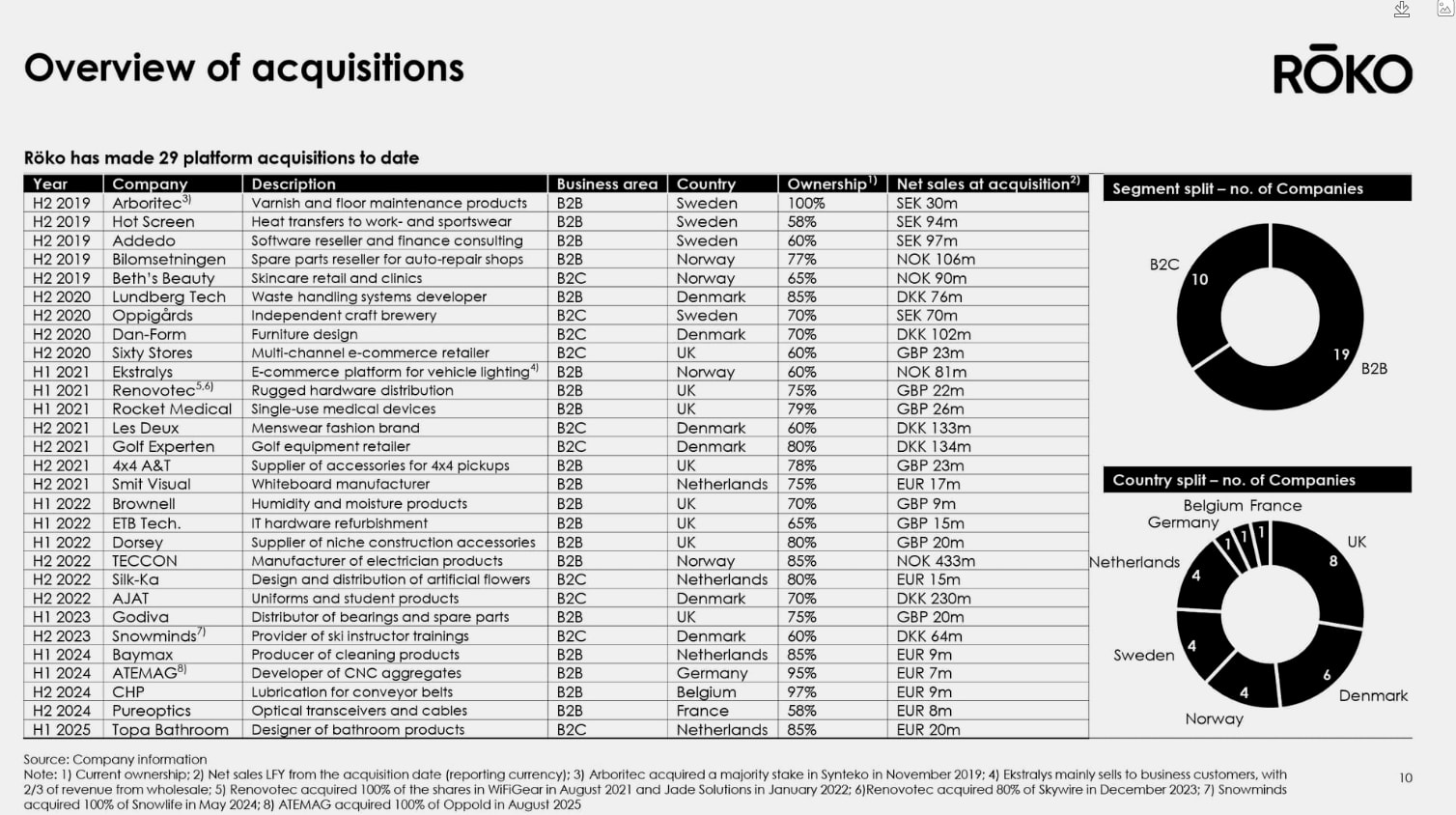 Lisäys. Tässä on Q3’25 -esityksestä kuvakaappaus ostetuista firmoista. Omistetuja liiketoimintoja on esimerkiksi autojen varaosakauppa, softamyyntiä, liukuhihnojen liukuvoiteita, kylpyhuonetuotteiden suunnittelijaa tai vaikkapa golf-varustekauppiasta.