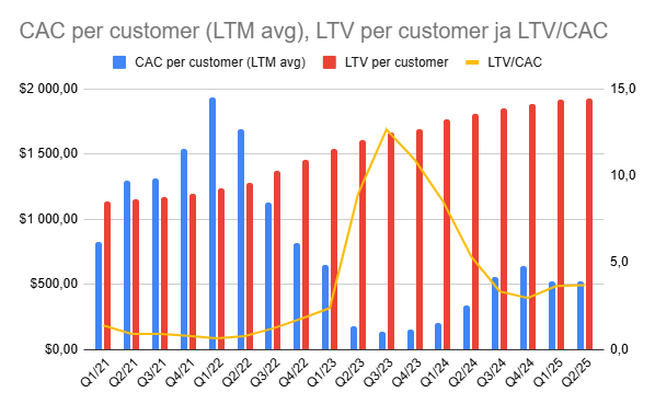 CAC beräknades som ett genomsnitt över fyra kvartal, eftersom värdenas variationer annars skulle vara ännu vildare.