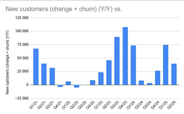 Jag beräknade också hur många nya kunder som tillkommit kvartalsvis, det vill säga nettoavtalsmängdsförändringen plus churn. I detta diagram syns det att oprecisionen i retention och bedömningen av tariffhöjningar ger ut konstiga siffror, t.ex. för år -22.