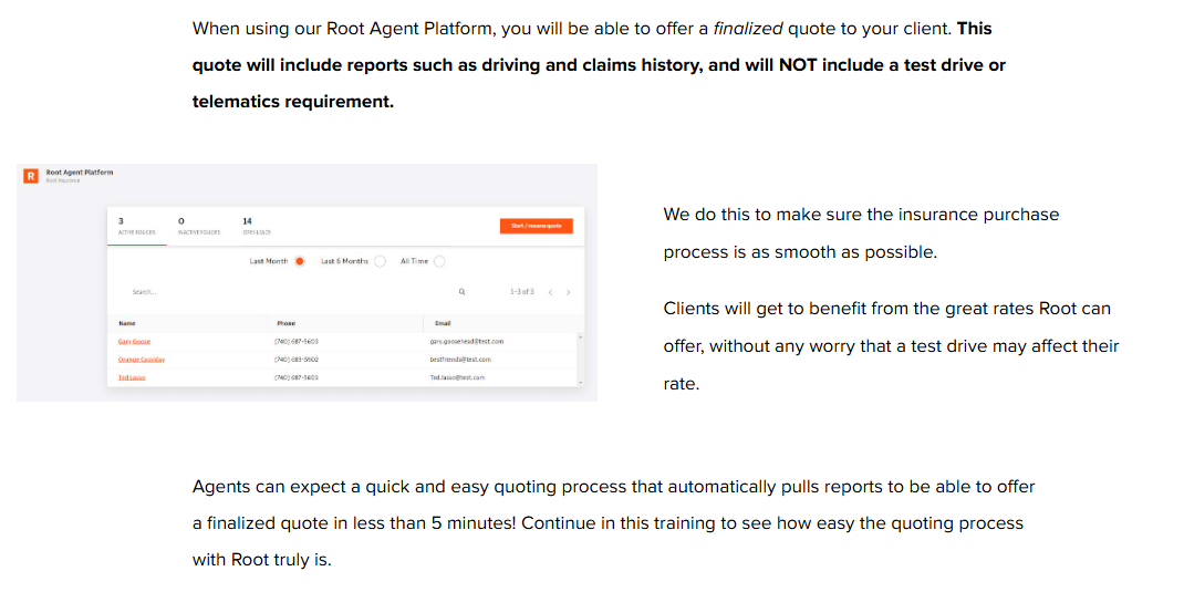 Är detta ROOTs lösning för att förbättra kundretention och accelerera kundanskaffning? Kunder som kommer via agenter behöver inte göra en provkörning eller binda telematik till avtal. Prissättningen görs med traditionella metoder. Agenter instrueras att vara tysta om avtal kopplade till telematik. De får endast berätta om det om kunden specifikt frågar om saken.