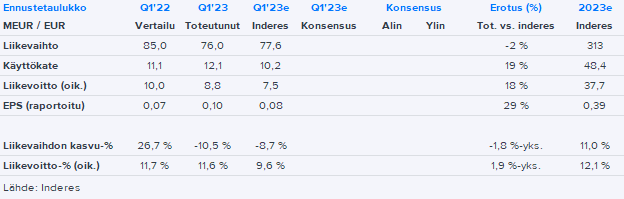 • Konsernin oikaistu käyttökate (EBITDA) laski 12,1 miljoonaan euroon (13,6), ja oikaistu käyttökatemarginaali laski 15,9 %:iin (16,0).