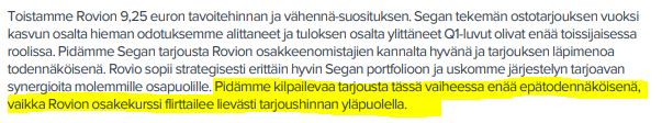 Ostotarjousprosessi kuitenkin ollut jo päällä melko pitkään, joten olisi ainakin omasta mielestäni yllättävää, jos vielä löytyisi paremman tarjouksen tiskiin heittävä kilpakosija, joka saisi myös Rovion hallituksen puolelleen. Teoriassahan tämä toki on edelleen mahdollista, mutta ei mielestäni mitenkään todennäköistä.