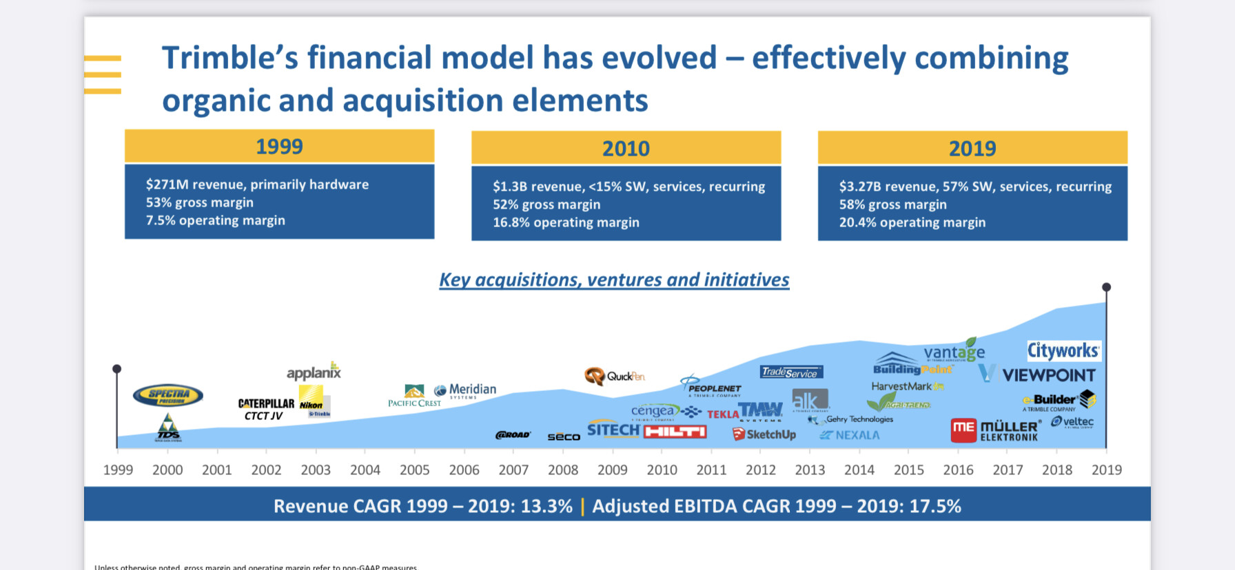 En ole Trimbleen tutustunut sijoituskohteena, mutta tuotteiden käyttäjänä kyllä. Käsittääkseni Trimble on kaikkeen mittaukseen ja suunnitteluun keskittynyt yhtiö. Maataloudessa on ollut käytössä Trimblen paikannus-ja automaatiojärjestelmiä jo kai pari vuosikymmentä,eli sikäli ala ei ole heille uusi.