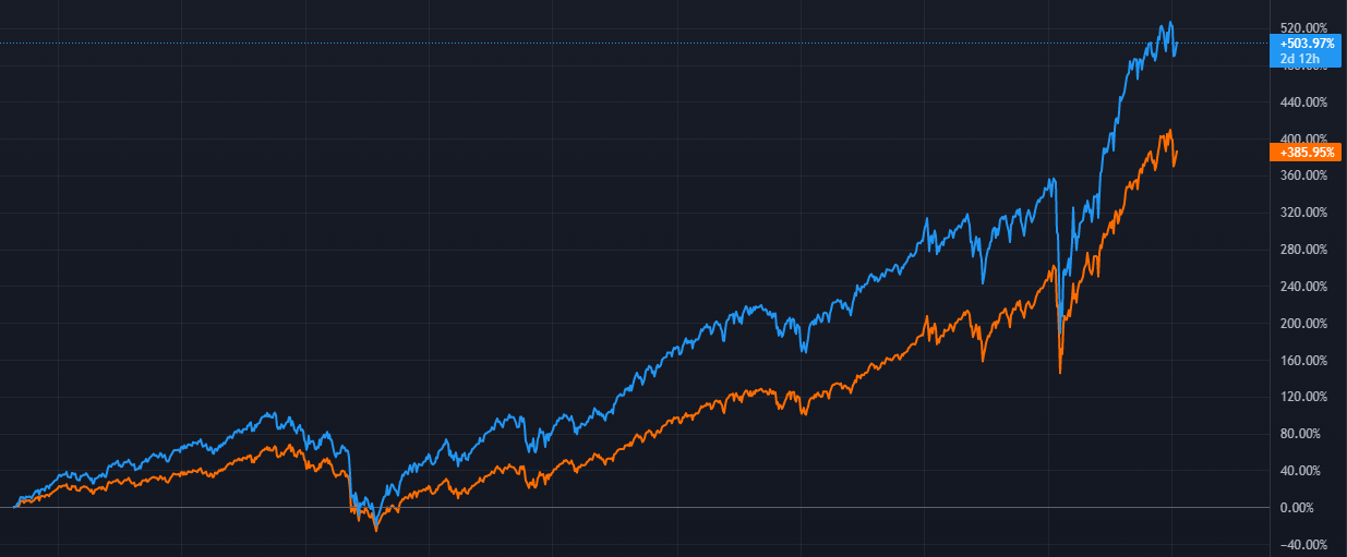 Miksi equal weight eikä suoraan S&P 500? Alla olevassa graafissa näiden indeksien tuotto vuodesta 2004 eteenpäin (kiitos Stunados discordissa tästä graafista). Sinisellä equal weight ja oranssilla S&P 500.