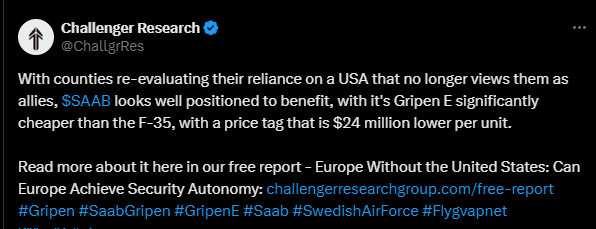 Trump on mullistanut puolustusmarkkinat ja näkisin että Saab on hyötyjä, koska USA menettää kauppoja uuden ulkopoliittisen linjansa takia. Niin hullulta kuin se voi kuulostaa, pidän täysin mahdollisena että Kanadasta tulee 50+ koneen tilaus, viimeksi Saab oli siellä hankintakilpailun 2.
