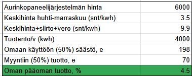 This un-realistic hectare estimate does not take into account the reduced purchase price due to the household deduction and possible competitive bidding, and the share of own consumption in production has been estimated too low because I used the share of own use of an actual 7.8 kWp power plant located at the same address. As the power and energy amount of the power plant decrease, the share of own consumption in production increases, so the actual outcome is better than this quick estimate of mine.
