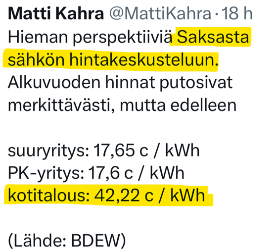 Avasin tuon twiittaajan referoiman BDEW:n tuottaman raportin, siinä noihin mainittuihin lukuihin mahtuu kylläkin kaikenlaista muuta kuin pelkkä sähkön hinta.