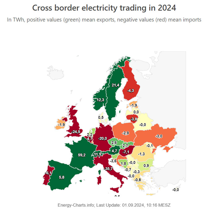 “In the first 8 months of 2024, Germany imported a net 20 TWh of electrical energy. Almost half was supplied by France. In the 12 months of 2023, Germany imported a total of 11.7 TWh. In previous years, Germany was a net exporter of electricity.