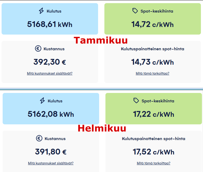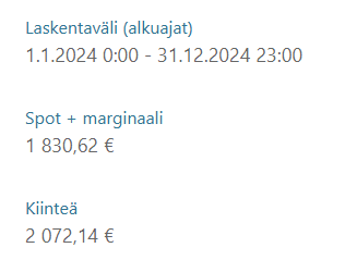 No one has managed to convert me into a supporter of spot-priced electricity yet. Last year was particularly cheap for spot prices and the winter was mild, but as can be seen from the years of monitoring, the theoretical cheapness of spot electricity varies quite a lot from year to year. For an electric heater and electric car owner like me, nothing else really matters but how much electricity costs between December and March. Everything else is noise.