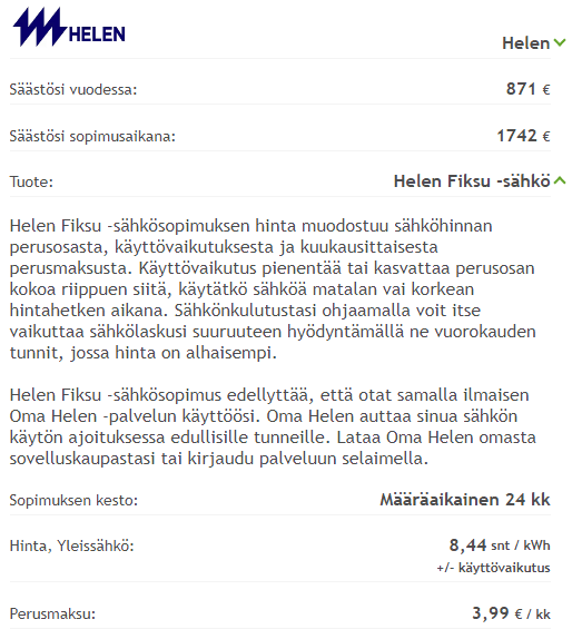 Kilpailuttaja.fi - sivuston kautta Helenin 24 kk määräaikainen sopimus 8,44 c + 3,99/kk.