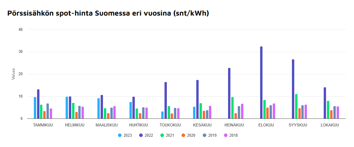 Vuosi 2022 kallis ja 2021 tavallista hintavampi, mm. Joulukuussa jolloin oli kovat pakkaset. Kuitenkin sähkönhintakriisi 22/23 spotit ihan omalla tasollaan ja gazpromi mainosti ”eurooppa jäätyy”. Onneksi tämä lie nyt selätetty