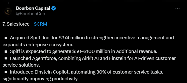 Vuonna 2021 Salesforce toteutti suurimman yritysostonsa, kun se hankki Slack-yhteistyöalustan 27,7 miljardilla dollarilla. Tämän hankinnan myötä yhtiö vahvisti asemaansa liiketoimintasovellusten markkinoilla. Salesforce on jatkanut innovointia ja esitteli vuonna 2024 uuden Einstein Copilot -nimisen tekoälypohjaisen sovelluksen terveydenhuollon tarpeisiin.