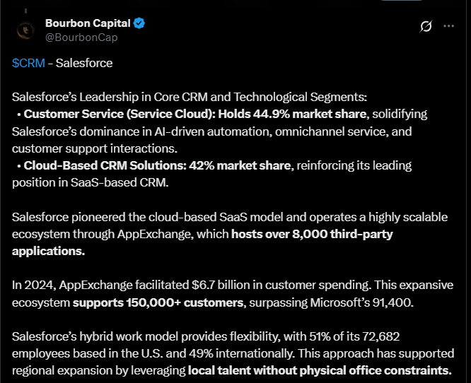 Salesforce on edelleen kuitenkin kasvanut, ja sen taloudelliset tunnusluvut ovat vahvoja, mutta näistä luvuista huolimatta on tärkeää huomioida, että kilpailu CRM-markkinoilla on erittäin kovaa. Yhtiö hallitsee markkinoita ja sillä on merkittävä markkinaosuus, mutta sen kilpailijat kehittävät jatkuvasti uusia ja houkuttelevia vaihtoehtoja, jotka voivat uhata sen asemaa pitkällä aikavälillä.