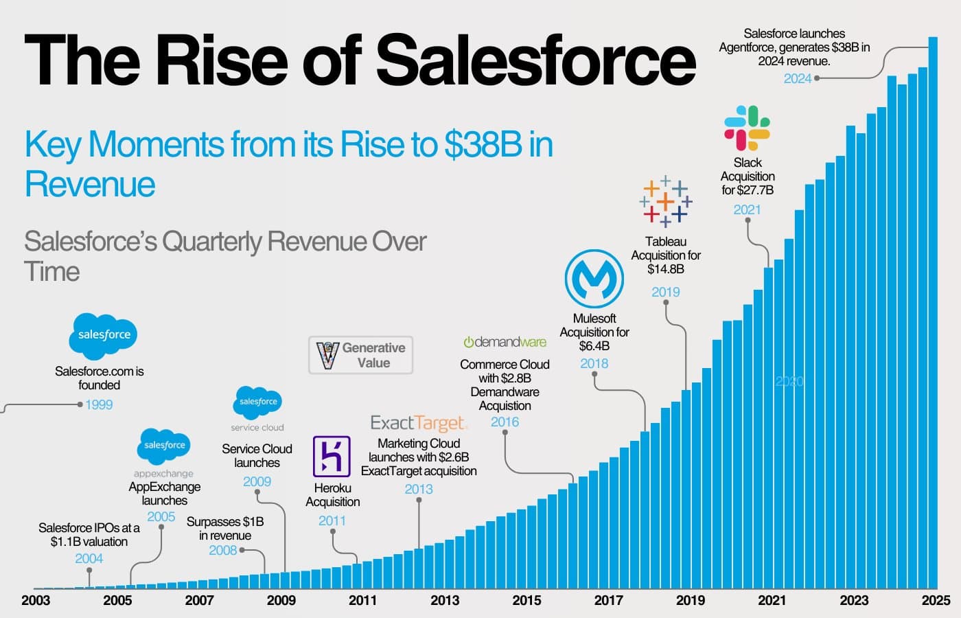 Salesforce perustettiin helmikuussa 1999 entisen Oracle-johtajan Benioffin toimesta. Yritys kasvoi nopeasti ja listautui New Yorkin pörssiin vuonna 2004. Nykyään Salesforce on yksi maailman suurimmista ohjelmistoyrityksistä. Vuonna 2023 yhtiö oli sijalla 491 Fortune 500 -listalla, liikevaihdon ollessa 31 miljardia dollaria liikevaihtoa.