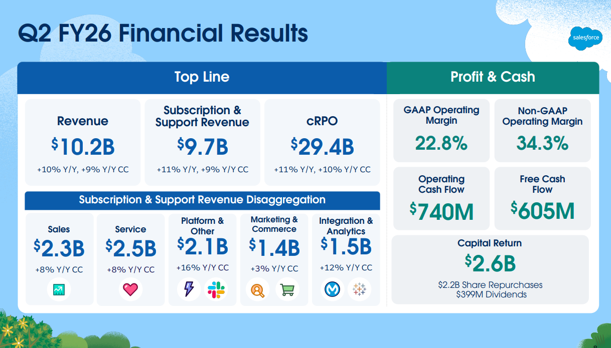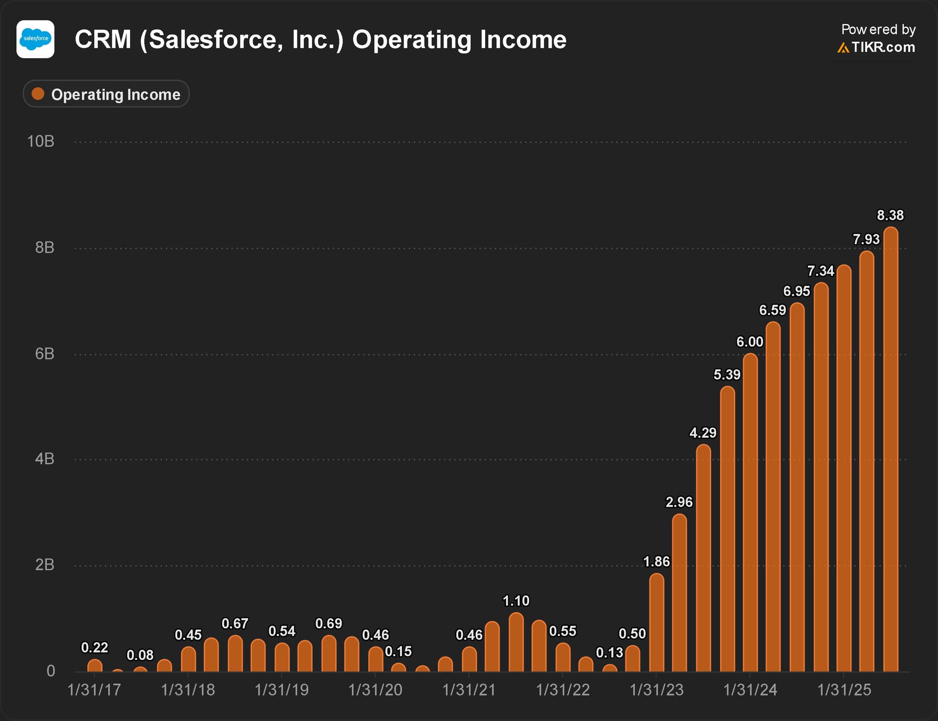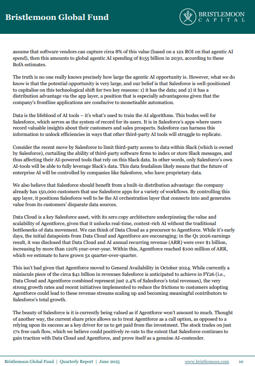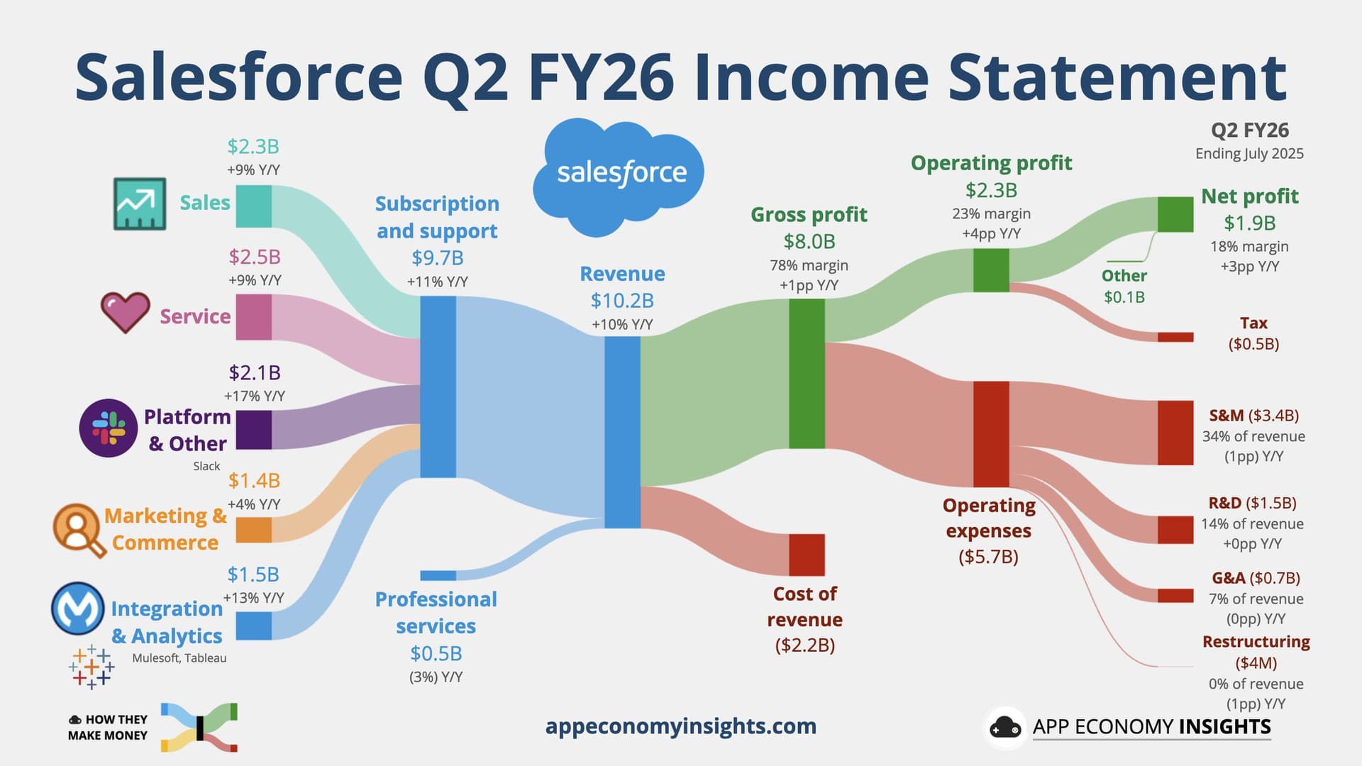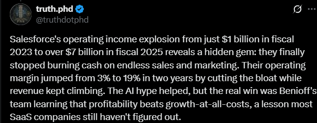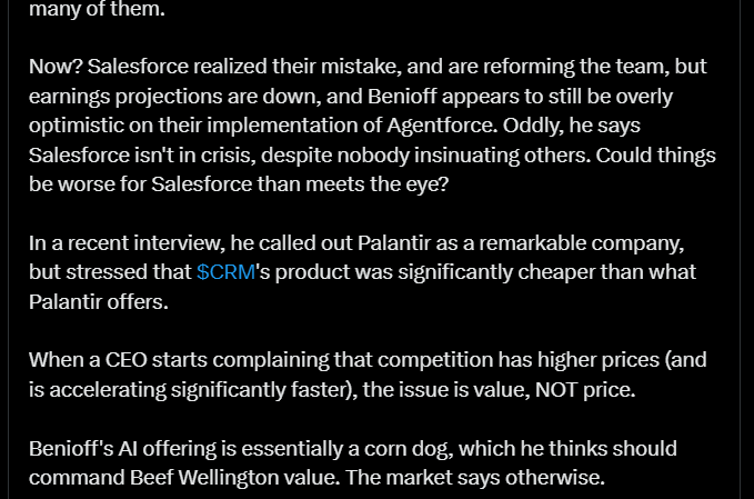 Sillä on nyt vakaampi kannattavuus, mutta toisaalta sen kasvua hidastaa kilpailijat ja myös raskaskulurakenne. Toisaalta, kuten ketjussa aiemmin on todettu, niin yhtiön tulevaisuus mahdollisesti kehittyy tekoälyagenttien ekosysteemin (Agentforce + A2A) ympärille.
