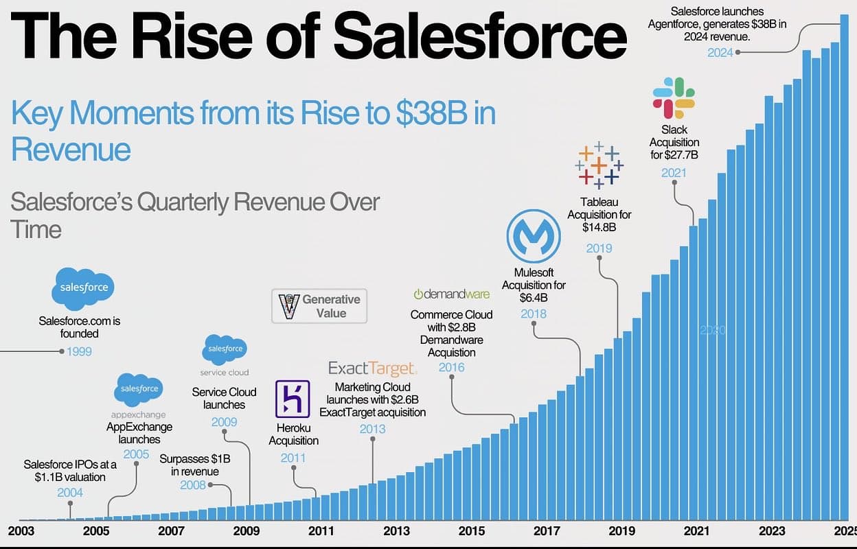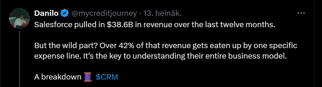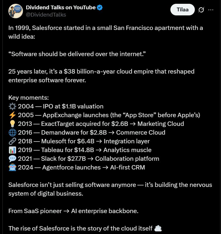 Mä tässä sunnuntaiyöllä vähän pohdiskelin, että Salesforce on edelleen valtava toimija CRM-markkinoilla ja on yksi maailman suurimmista pilviohjelmistoyhtiöistä. Hienoa.