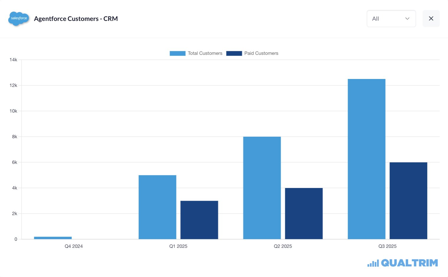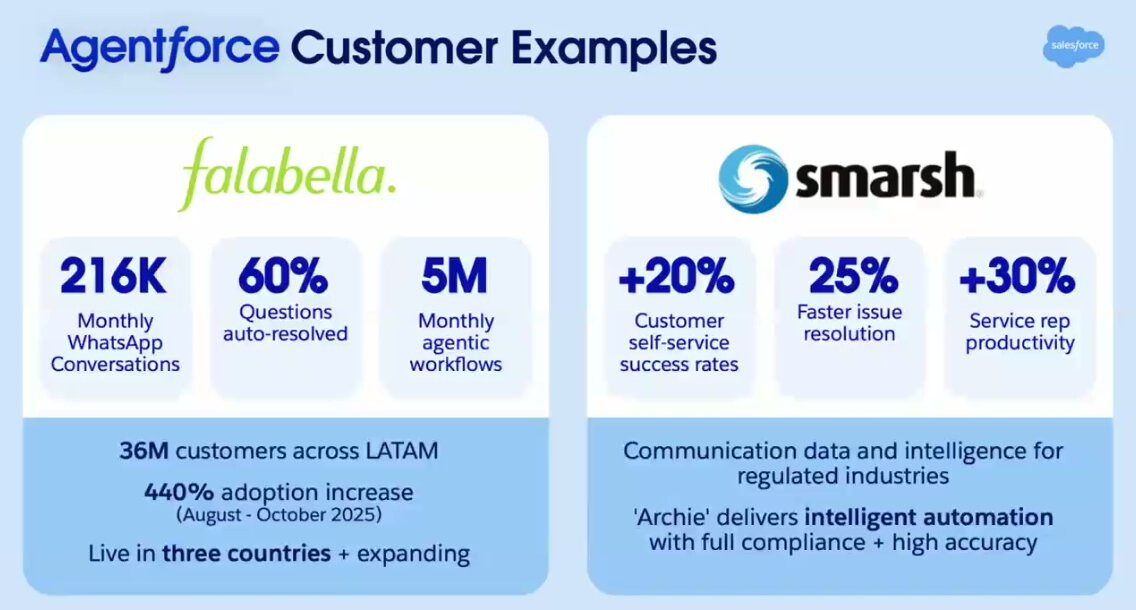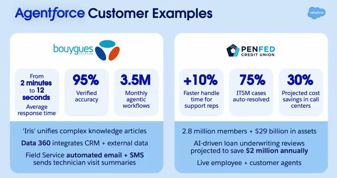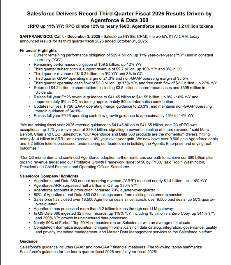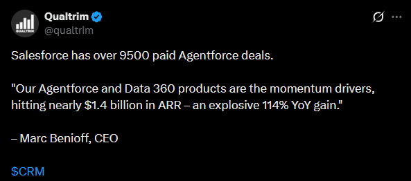 Agentforce-alusta alkaa tuoda selvästi lisää liikevaihtoa yhtiölle ja iso osa uusista sopimuksista syntyy jo olemassa olevien asiakkaiden kanssa, koska yritykset siirtävät tekoälyagentit kokeiluista oikeaan käyttöön, niin Salesforce hyötyy trendistä.