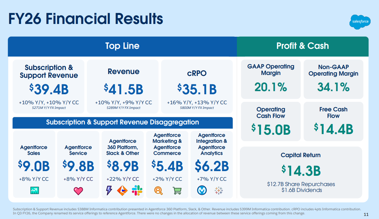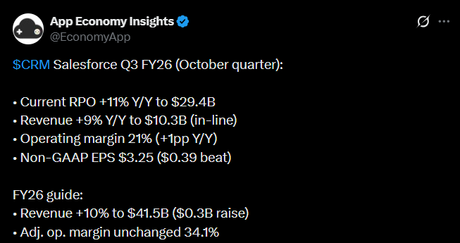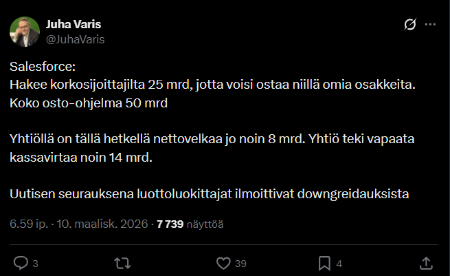 Salesforce tulos oli tyydyttävä. Kannattavuus ylitti selvästi odotukset ja liikevaihto oli sellainen, mitä oli odotettu. Vapaan kassavirran kehitystä kehuttiin. Yhtiö korosti tekoälypohjaisen Agentforce nopeaa kasvua.