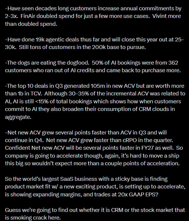 Agentforce ja Data 360 vetävät kovaa ja ovat nyt koko tuloskatsauksen tähtiveturit tuoden selvästi kovinta kasvua ja toki myös uusia asiakkuuksia. Samalla kassavirta pysyi vahvana ja marginaalit paranivat.