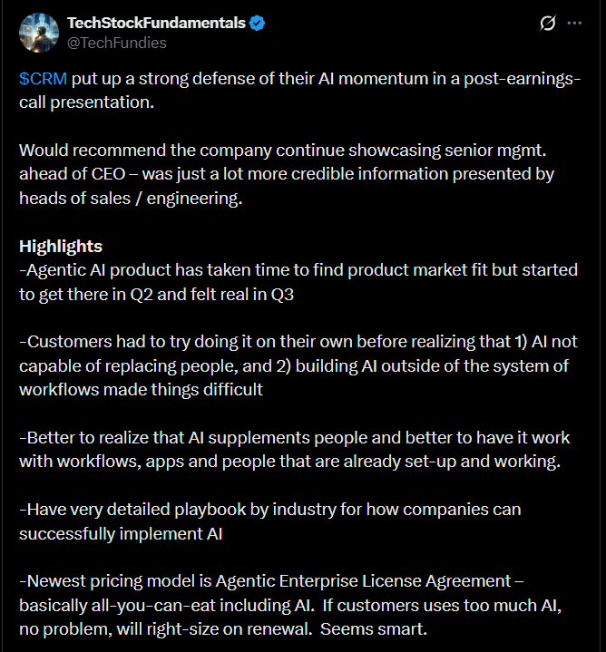 Alla olevassa tviitissäkin korostettiin sitä, että yhtiö puolusti vahvasti AI-strategiaansa tulosjulkistuksen jälkeen ja antoi tviittaajan mukaan uskottavan kuvan etenemisestään, erityisesti myynnin ja teknologiajohdon esiintyessä.
