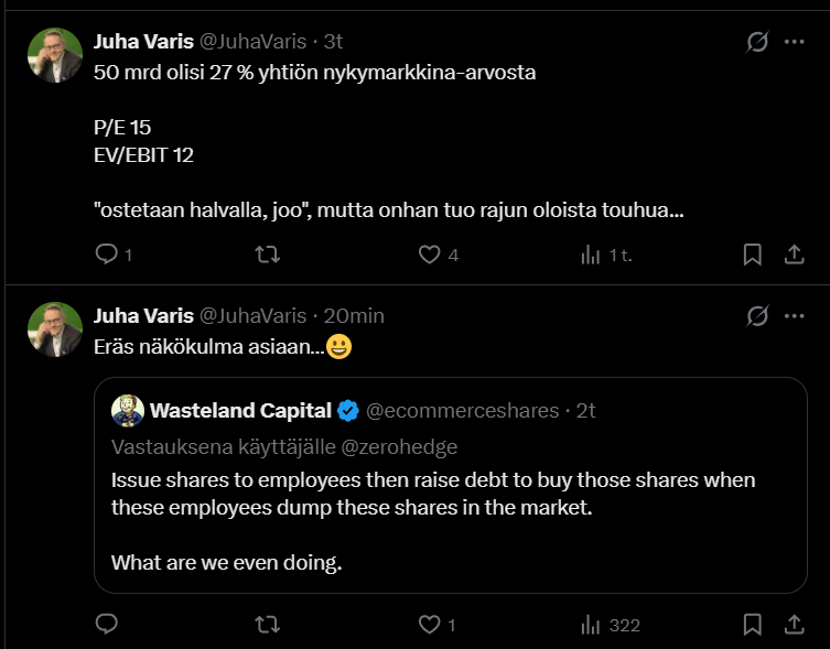 Tuloksen “laatu” heikkenee heikkenemistään. Ei nyt valtavista eroista puhuta, mutta ainakin tässä tapauksessa ne skaalaedut hupenevat aivan joillekin muille kuin osakkeenomistajille. Tarkkana saa olla näiden kanssa