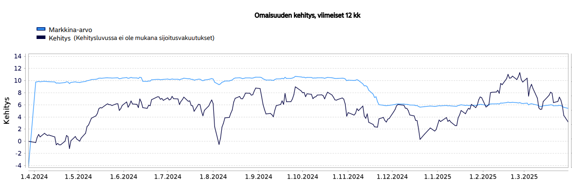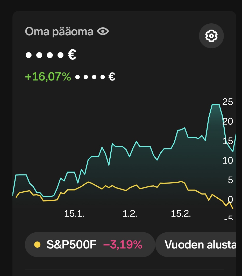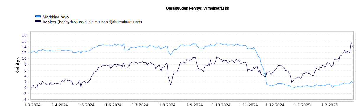 Helmikuu on nyt takana. Sijoitusten kehitys on ollut vuonna 2025 ihan kohtuullista. En ole paljoa tehnyt myyntejä tai ostoja, joten siltä osin ei ole suuria kuluja.